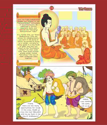 Five long aeons ago, the Bodhisatta was an honest trader selling fancy goods in the kingdom of Seriva. Sometimes he traveled with another trader from the same kingdom, a greedy fellow, who handled the same wares.
