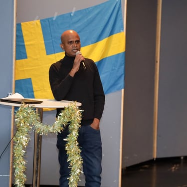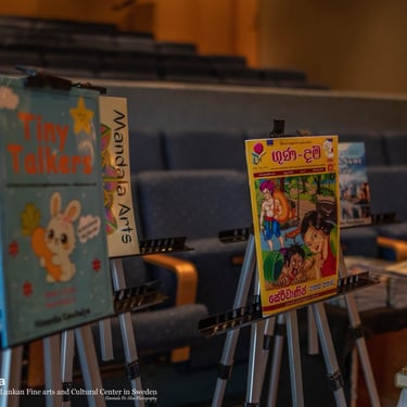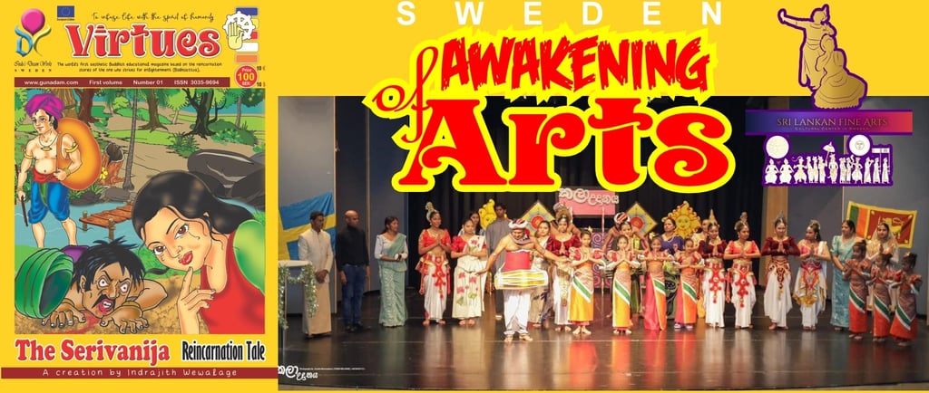 The “Sweden Art Festival”, scheduled for 15 November 2025 at Aulan, Gymnasievägen 1, 141 38 Huddinge, was organized by the Sri Lanka Academy of Fine Arts in Sweden. This festival marked the inaugural public presentation of Sri Lankan traditional arts performed and preserved by Sri Lankans residing in Sweden. In addition, the event featured an exhibition and sales stall of Sri Lankan traditional handicrafts, the launch of Swedish-language learning workbooks and children’s storybooks authored by emerging Sri Lankan writer Nimanka Kaushalya, and the historic public release of the world’s first Buddhist Jātaka Comic Newspaper (Virtues), created by visual artist Indrajith Wewalage.